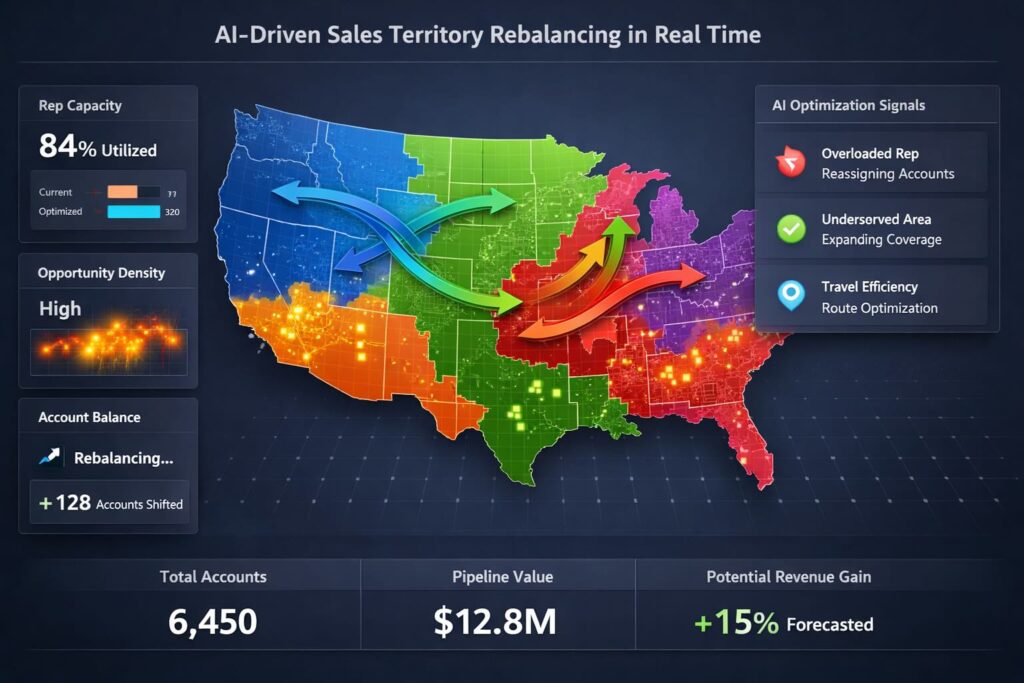 Intelligent territory rebalancing uses automation and data signals to continuously adjust coverage ensuring opportunities don’t pile up in one place while others go untouched.